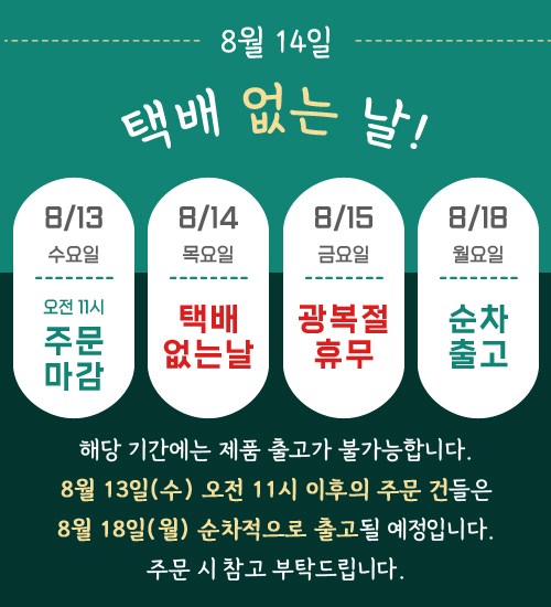 ★ 2025년 8월 14일(목) 택배 없는 날 출고 휴무 안내 ★