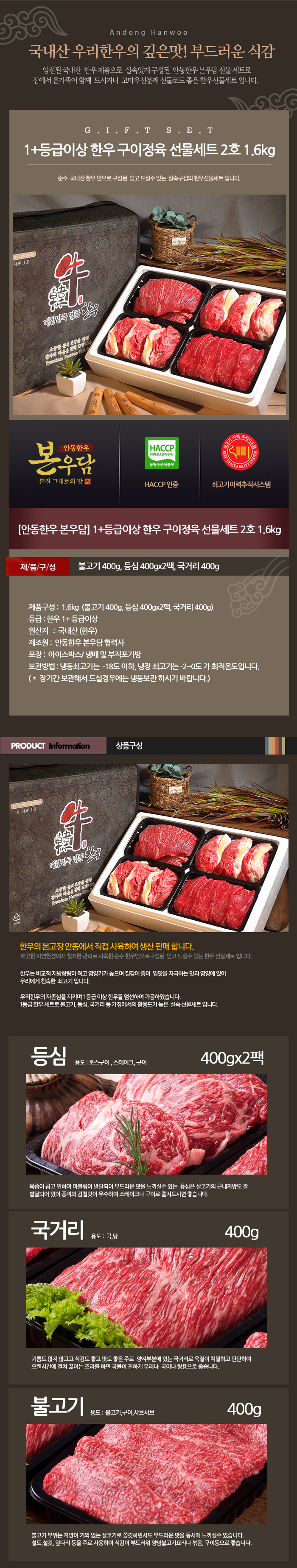 [안동한우 본우담] 1+등급이상 한우 구이정육 선물세트 2호 1.6kg (불고기400g+등심400g+등심400g+국거리400g) M
