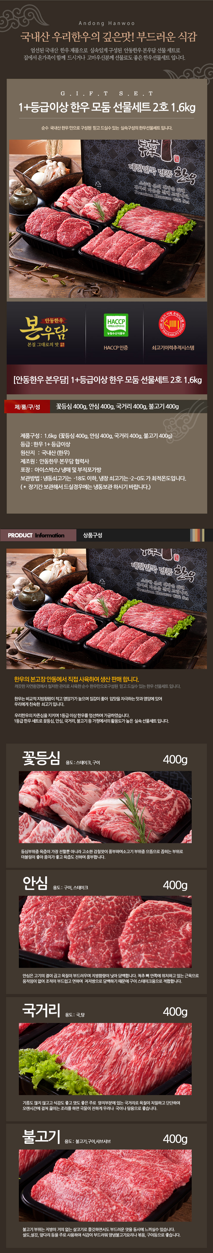 [안동한우 본우담] 1+등급이상 한우 모둠 선물세트 2호 1.6kg (꽃등심400g + 안심400g + 국거리400g + 불고기400g) M