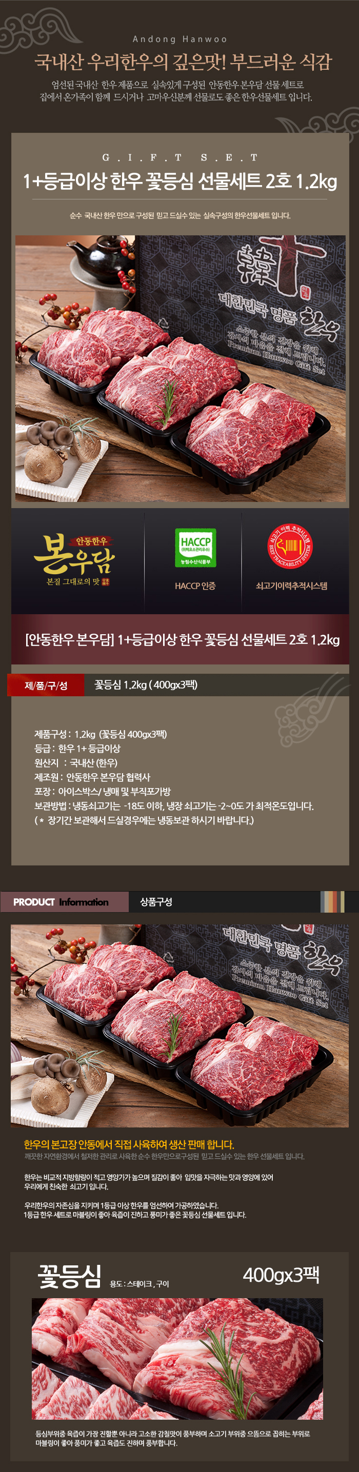 [안동한우 본우담] 1+등급이상 한우 꽃등심 선물세트 2호 1.2kg (꽃등심400g x 3팩) M