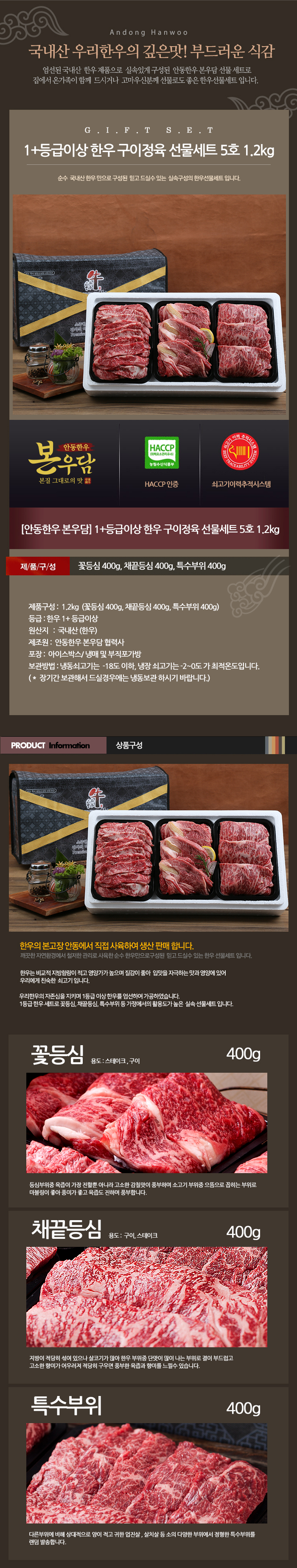 [안동한우 본우담] 1+등급이상 한우 구이정육 선물세트 5호 1.2kg (꽃등심400g + 채끝등심400g + 특수부위400g) M