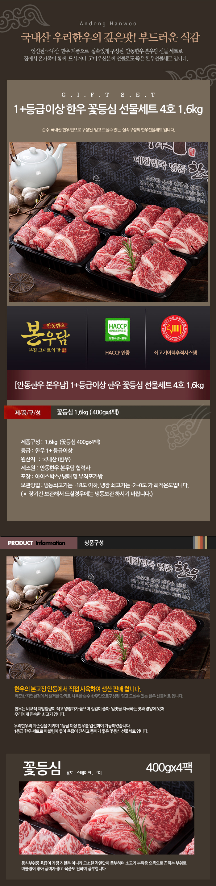 [안동한우 본우담] 1+등급이상 한우 꽃등심 선물세트 4호 1.6kg (꽃등심400g x 4팩) M