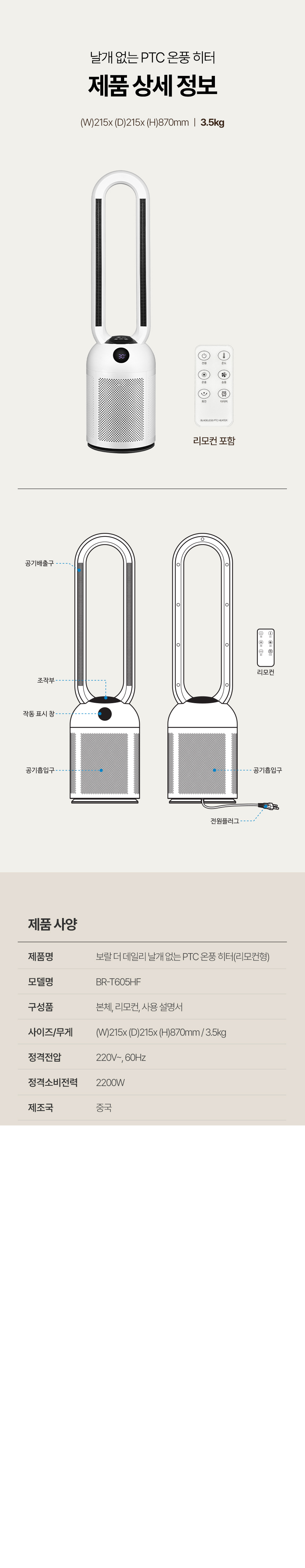보랄 더 데일리 날개 없는 PTC 온풍 히터 (리모컨형) BR-T605HF