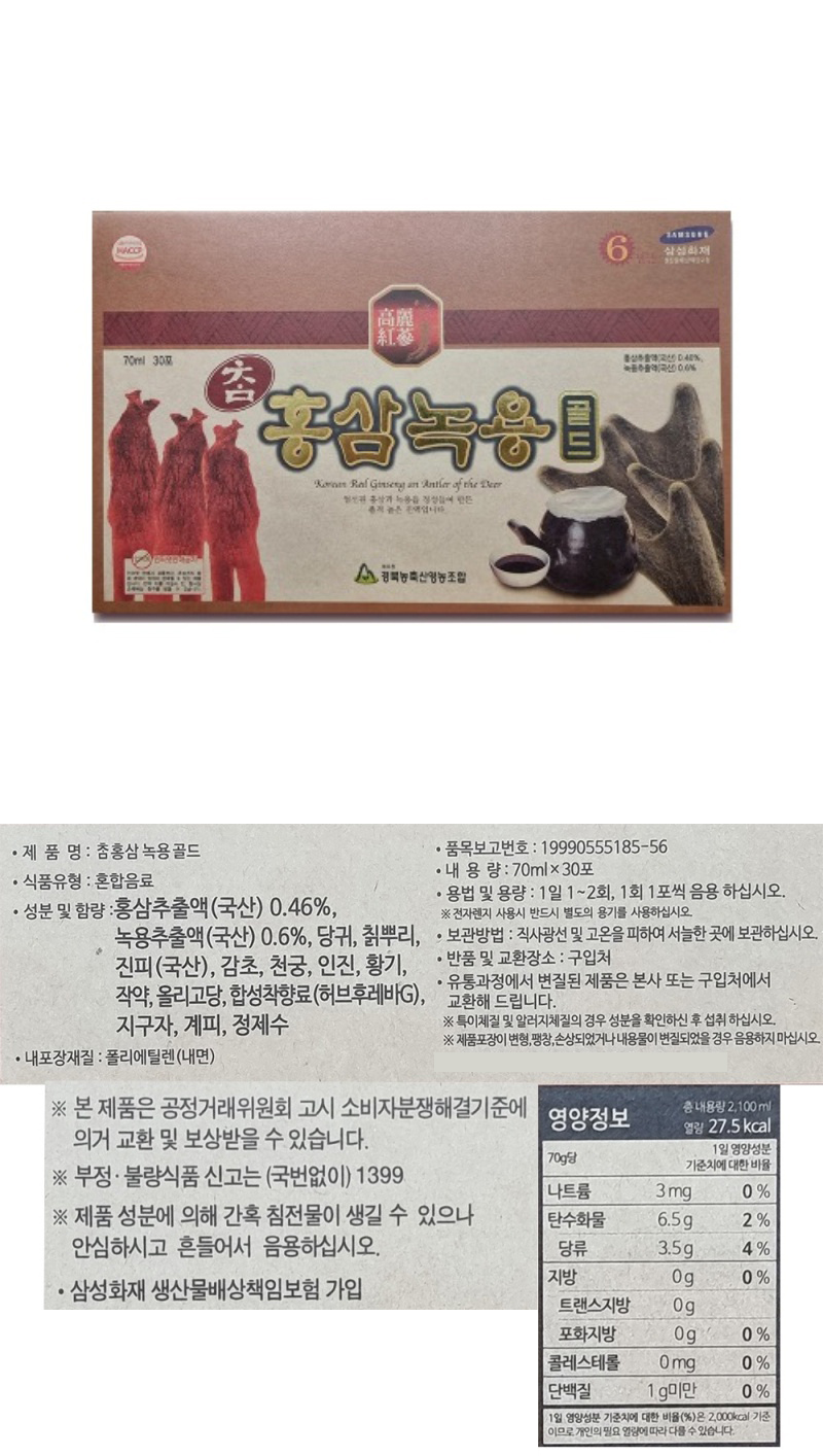 [경북농축산영농조합] 참홍삼녹용골드 70ml x 30포 + 핸드캐리어