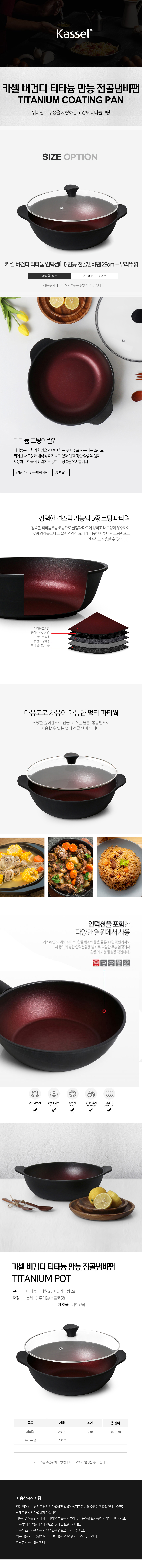 [Kassel] 카셀 버건디 티타늄 (IH)인덕션 만능 전골냄비팬 28cm + 유리뚜껑 28cm